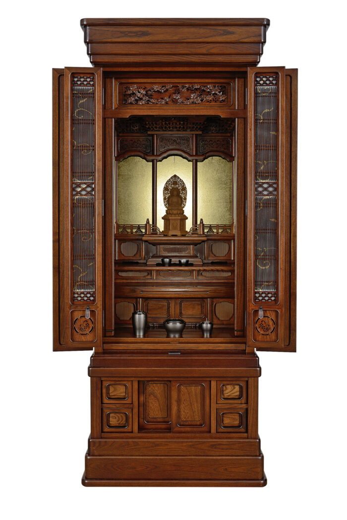 二方厚板張り・角丸・透かし彫り無垢ランマ・台輪大引出を搭載した満足仕様のお仏壇です。